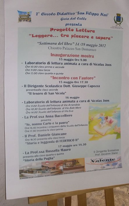 Alle 17.30 il dottor Giuseppe Capozza, dirigente scolastico, ha presentato alle classi seconde “Il tesoro di San Nicola”, il 16 maggio ancora lettura animata, questa volta nei plessi della Scuola dell’Infanzia per la gioia dei più piccini e nel pomeriggio “Io, nonno Carlo e la paura”, presentazione dell’autrice professoressa Anna Baccelliere dedicata agli alunni delle prime e in procinto di farne parte.