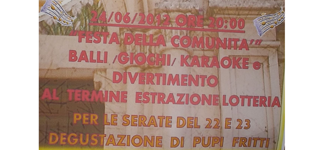 Domani, domenica 24, dalle ore 20.00 in poi, “Festa della Comunità” con balli, giochi, karaoke e divertimento. A fine serata l’estrazione dei biglietti vincenti della lotteria parrocchiale.